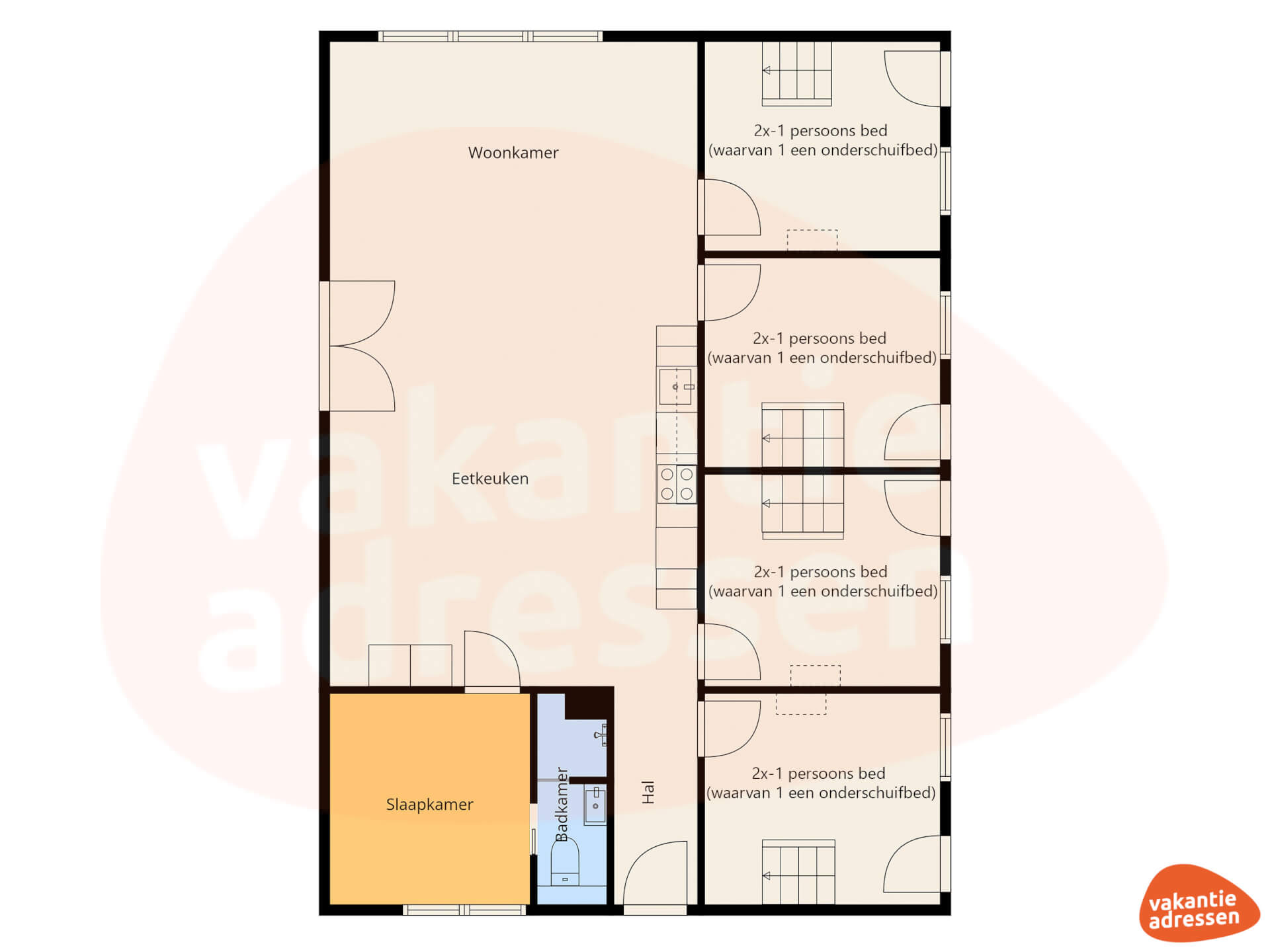 2x-1 persoons bed (waarvan 1 een onderschuifbed) op de begane grond