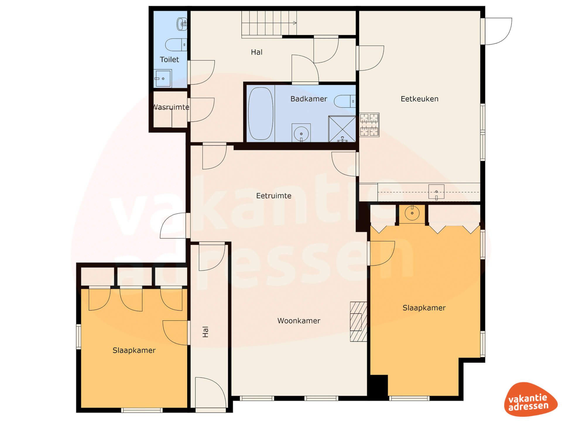 Drie van de 6 slaapkamers bevinden zich op de begane grond, elk met een 2-persoonsbed. Eén badkamer heeft een douche, toilet en wastafel, de tweede badkamer is voorzien van inloopdouche, toilet, urinoir en dubbele wastafels. De accommodatie is rolstoelvriendelijk: drempelloos op de begane grond en met aangepaste voorzieningen bij de badkamer. Op de bovenverdieping zijn 3 slaapkamers (één met een 2-persoonsbed en twee met vier 1-persoonsbedden), een aparte wasruimte en een extra toiletruimte.