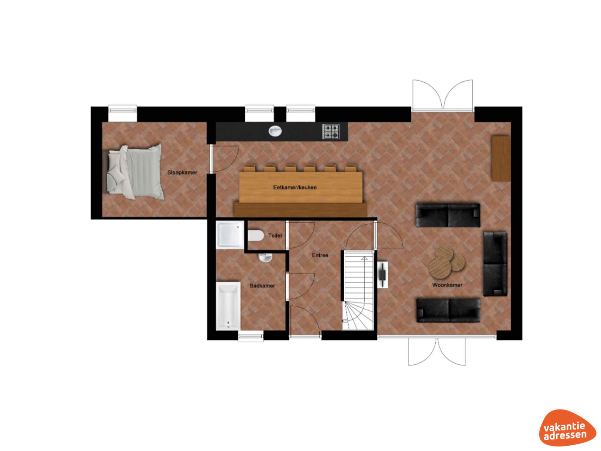 De royale woonkamer is met warme kleuren en oog voor detail ingericht, voorzien van comfortabele banken en fauteuils. Via de geluidinstallatie met bluetooth-koppeling luister je naar je eigen muziek, terwijl de tv voor extra ontspanning na een dag vol activiteiten zorgt. De vloerverwarming verspreidt een aangename warmte: koude voeten zijn dus verleden tijd! De landelijke, goed uitgeruste keuken biedt volop ruimte om samen te koken. Je beschikt o.a. over een groot gasfornuis met 90 cm oven, een ruime koelkast en uiteraard een vaatwasser, zodat de vieze vaat snel uit het zicht is. Ook een kop thee, cappuccino of een vers geperst citrussapje is in een handomdraai gemaakt. De grote eettafel nodigt uit tot gezellig samen eten of spelletjes spelen. Op aanvraag kan een fornuisrek geplaatst worden voor extra veiligheid in de keuken.