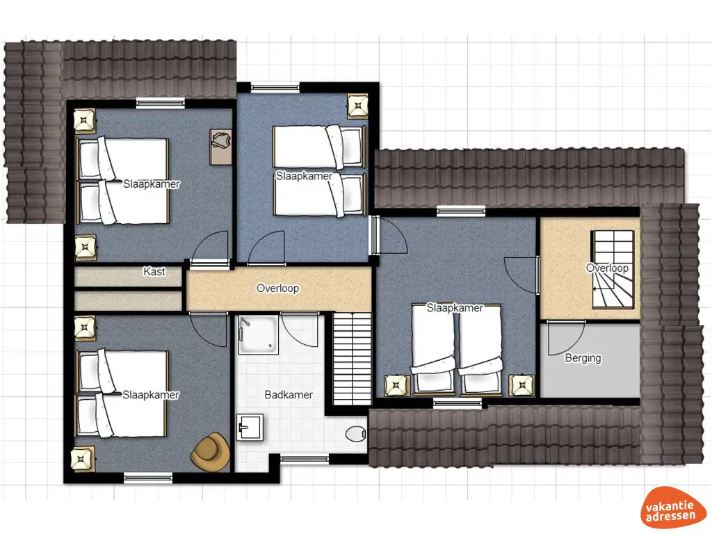 Op de begane grond zijn de eerste 2 slaapkamers, een badkamer en een separaat toilet te vinden. Op de eerste verdieping zijn 4 ruime slaapkamers te vinden, naast een ruime badkamer met douche, toilet en wastafel. De ruimtes bieden de mogelijkheid om een kinderbedje te plaatsen. Alle kamers zijn met warme kleuren zeer smaakvol ingericht, zodat je echt tot ontspanning komt en kunt genieten van een goede nachtrust.