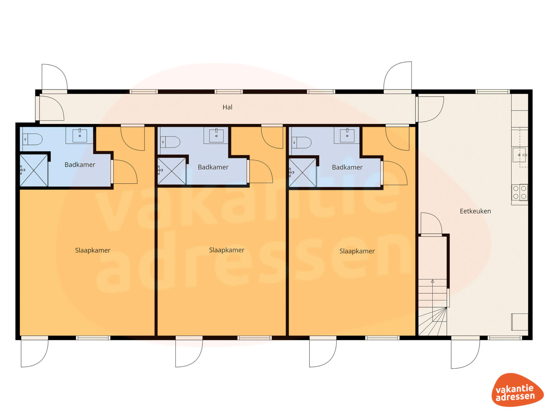 Bij 15 / 16 / 17 personen: 8 slaapkamers + 5 badkamers/douches