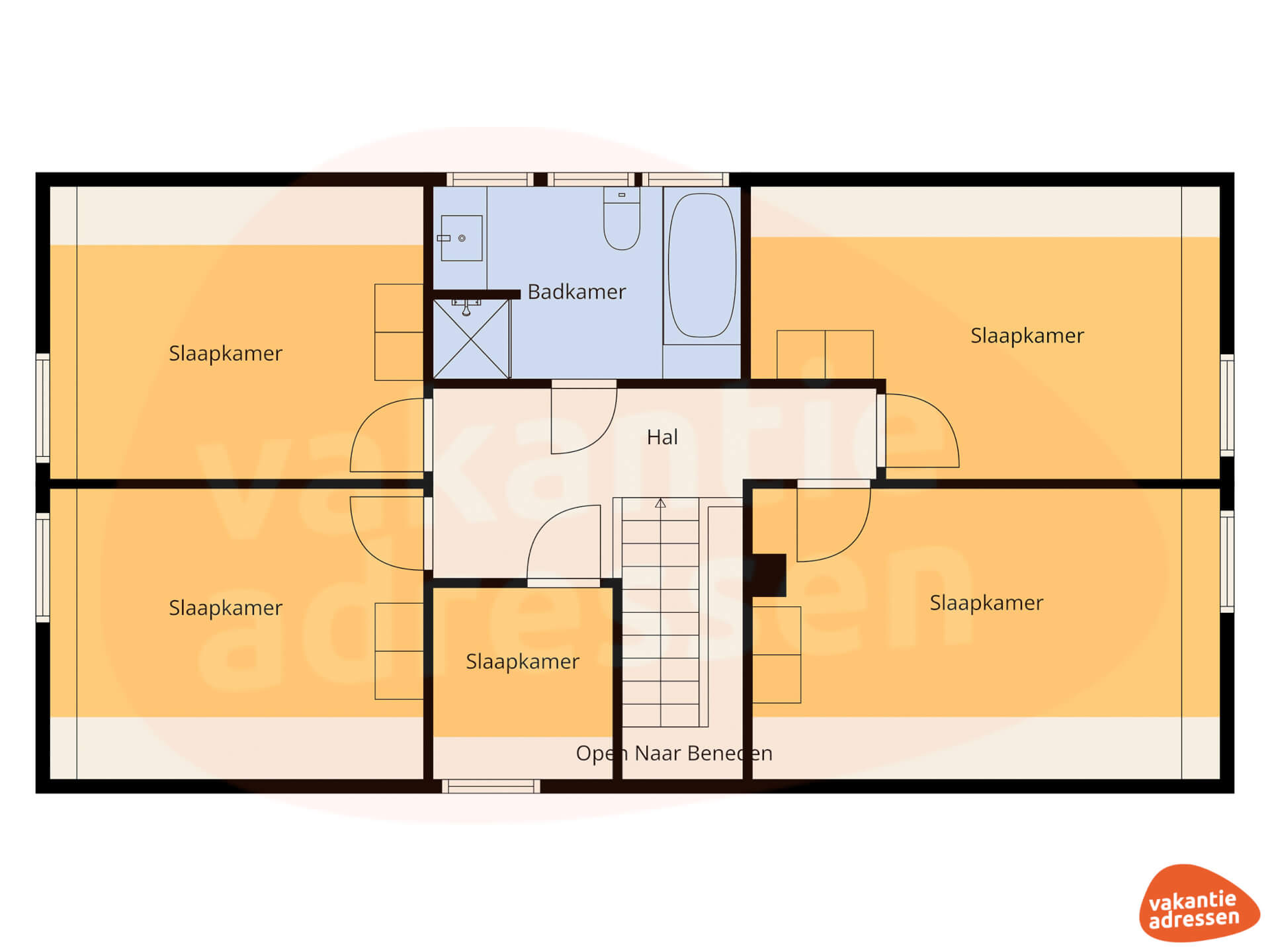 De accommodatie beschikt over 6 comfortabele slaapkamers, waardoor iedereen voldoende ruimte en privacy heeft tijdens het verblijf. De kamers zijn eenvoudig maar sfeervol ingericht en bieden een rustige plek om na een actieve dag tot rust te komen. Op de begane grond bevindt zich al 1 slaapkamer met twee 1-persoonsbedden, de 5 overige kamers bevinden zich op de bovenverdieping. Daarnaast zijn er 2 badkamers met douche, toilet en wastafel, zodat meerdere gasten zich tegelijkertijd kunnen klaarmaken voor de dag. De praktische indeling van de kamers en badkamers maakt deze woning zeer geschikt voor een ontspannen verblijf met een grotere groep.