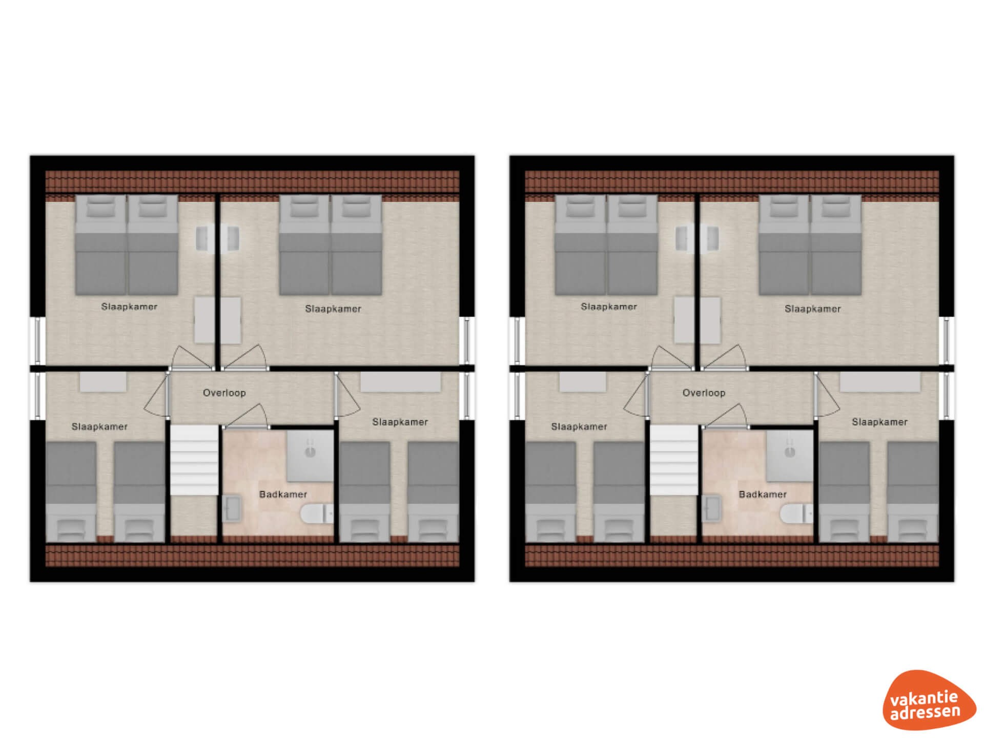 Met acht 2-persoonskamers verdeeld over twee vakantiehuizen is deze accommodatie uitermate geschikt voor groepen tot 16 personen. In iedere woning bevinden zich 2 slaapkamers en een badkamer op de eerste verdieping. Vier van de acht slaapkamers zijn voorzien van een 2-persoonsbed en een eigen wastafel. De overige 4 slaapkamers zijn uitgerust met twee 1-persoonsbedden. De ruime slaapkamers zijn sfeervol ingericht en beschikken over comfortabele boxspring-bedden, zodat je van een optimale nachtrust kunt genieten. De twee badkamers zijn voorzien van een douche, wastafel en toilet, op de begane grond bevindt zich in beide huizen een separaat toilet.